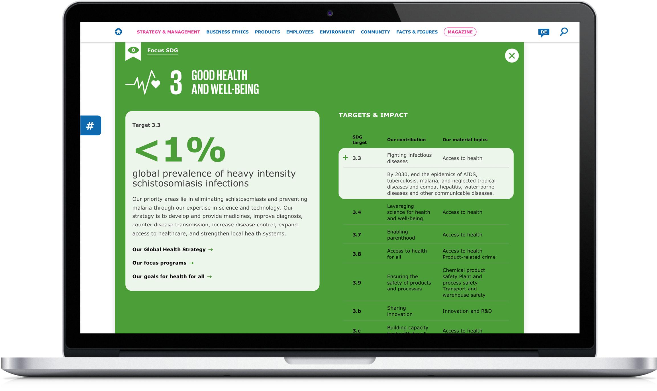 SDG target Our contribution Our material topics 3.3 Fighting infectious diseases Access to health By 2030, end the epidemics of AIDS, tuberculosis, malaria, and neglected tropical diseases and combat hepatitis, water-borne diseases and other communicable diseases. 3.4 Leveraging science for health and well-being Access to health By 2030, reduce by one third premature mortality from non-communicable diseases through prevention and treatment and promote mental health and well-being. 3.7 Enabling parenthood Access to health By 2030, ensure universal access to sexual and reproductive healthcare services, including for family planning, information and education and the integration of reproductive health into national strategies and programs. 3.8 Access to health for all Access to health